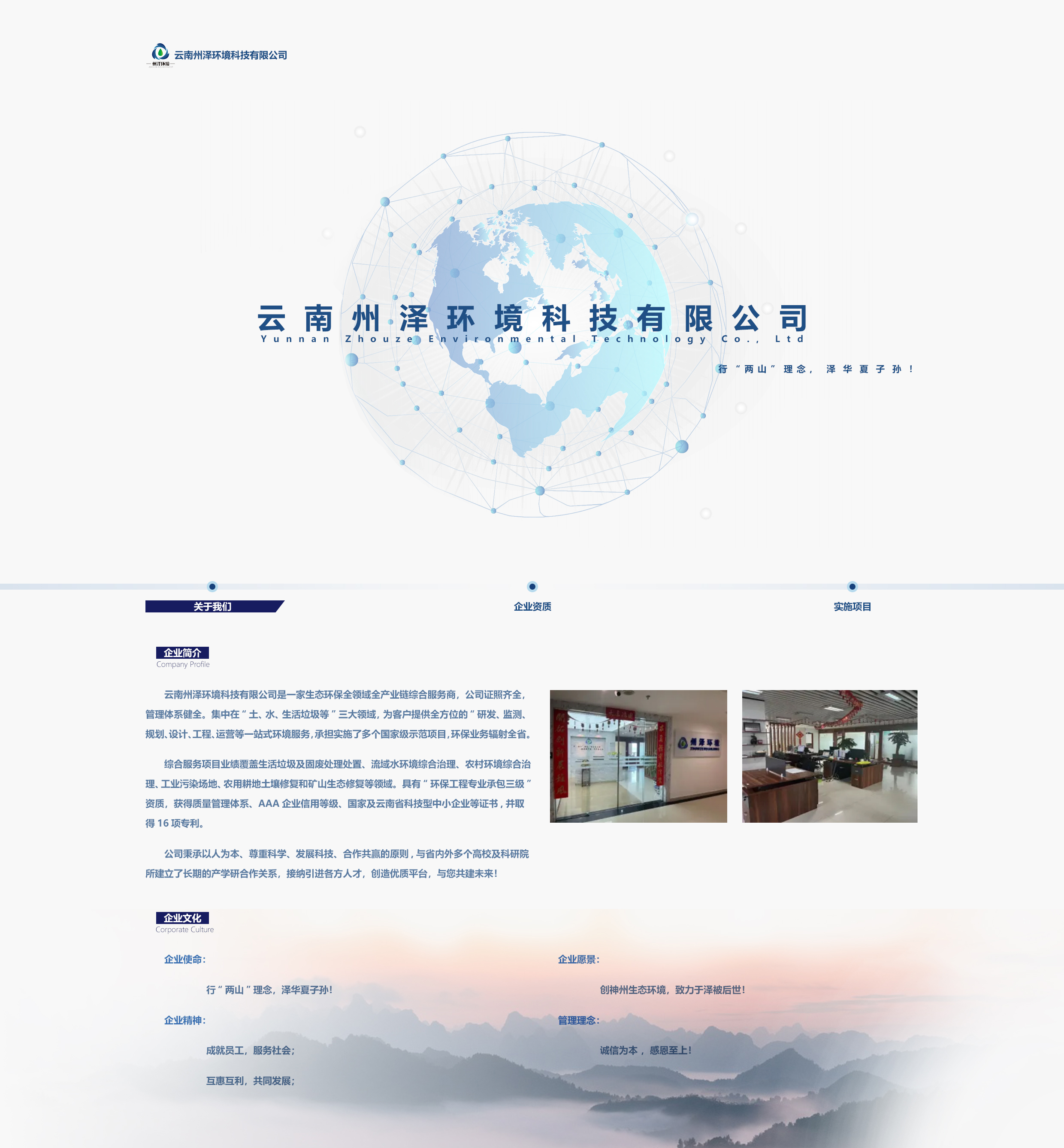 綜合服務(wù)項(xiàng)目業(yè)績(jī)覆蓋生活垃圾及固廢處理處置、流域水環(huán)境綜合治理、農(nóng)村環(huán)境綜合治理、工業(yè)污染場(chǎng)地、農(nóng)用耕地土壤修復(fù)和礦山生態(tài)修復(fù)等領(lǐng)域。具有“環(huán)保工程專業(yè)承包三級(jí)”資質(zhì),獲得質(zhì)量管理體系、AAA企業(yè)信用等級(jí)、國(guó)家及云南省科技型中小企業(yè)等證書,并取得16項(xiàng)專利。