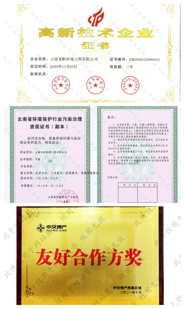 公司持有環(huán)保工程專(zhuān)業(yè)承包二級(jí)、市政公用工程總承包三級(jí)、建筑工程總承包三級(jí)、污染治理乙級(jí)、污染治理設(shè)施運(yùn)行服務(wù)二級(jí)資質(zhì)證書(shū)。前后獲得“十二五”生態(tài)文明建設(shè)突出貢獻(xiàn)單位、云南省省級(jí)成長(zhǎng)型中小企業(yè)、云南省知識(shí)產(chǎn)權(quán)優(yōu)勢(shì)企業(yè)、云南省科技型中小企業(yè)、云南省專(zhuān)精特新中小企業(yè)、招商蛇口最佳合作伙伴、中交置業(yè)友好合作方獎(jiǎng)等榮譽(yù)。